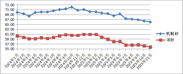 六、煤炭、水泥、砂石价格环比涨少跌多,同比均有所下降。11月份,我省动力煤(混煤5000大卡)、块煤(中块5000大卡)、水泥、机制砂(细砂)、河砂(细砂)平均出厂价环比2涨3降;同比均下降。